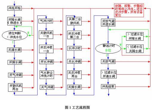1、氣水聯合反沖洗工藝流程: 所有設備的啟動和停止由操作人員在上位機發送指令或按周期自動判斷,由 PLC 自行完成操作。具體流程見 圖 1: