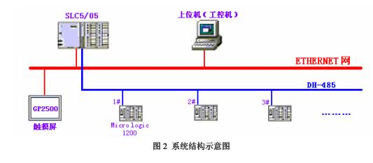 編制監控軟件;選用 AB 的小型 PLC SLC5/05 為控制器的主站,并對反沖泵及鼓風機進行控制;GP2500觸摸屏作為現場顯示控制單元;選用 AB 的微型 PLC Micro logix 1200作為各濾池的基本控制級,對各濾池的生產設備進行分散控制,模塊采用輸入模塊 1762-IF4、模擬量輸出模塊 1762-IF2OF2;通過 1761 NET-AIC 連通 DH-485 及 ETHERNET ,組成網絡,設置上位機及現場的人機界面,對生產管理和數據進行統計處理。