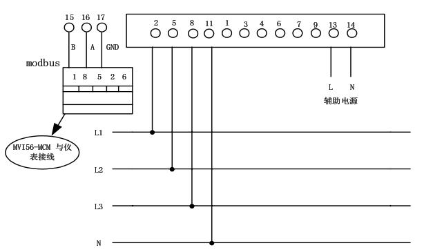 本應用中 Modbus設備使用的是DAETECH 公司的 EPM420A型網絡電力儀表,接線如圖: