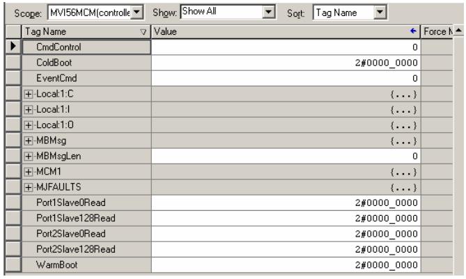 MCM1.ReadData: 讀數據區。一個從 Master 設備寫到作為 Slave設備的通訊口,或從 Slave設備讀取的數據。這個位置的數據是從 MVI56-MCM模塊返回到ControlLogix處理器的。 MCM1.WriateData: 寫數據區。位于 MCM1.WriteData中的數據是 ControlLogix處理器的信息及需要寫到模板的內部數據庫的信息。包括寫到 Slave設備的信息(設為 Master時),或寫到模板的信息(當口組態為 Slave時)。