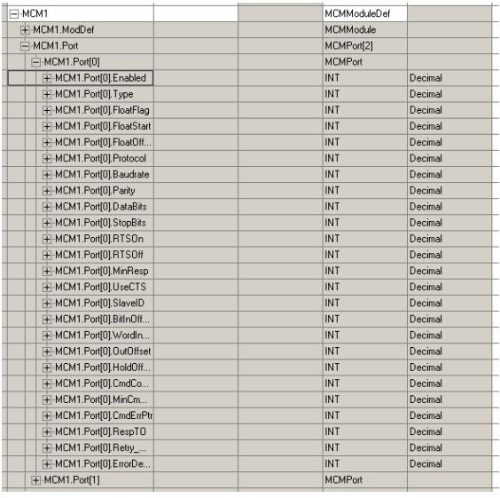MCM1.Port 是用來組態模板通訊的串口組態。 MCM1.Port [0] 對應 Port1,MCM1.Port [1] 對應Port2。
