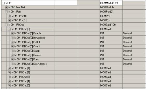 MCM1.P1Cmd,MCM1.P2Cmd 是用來設定模板的 Modbus master 命令。每個口最多可組態 100個 Modbus master 命令。