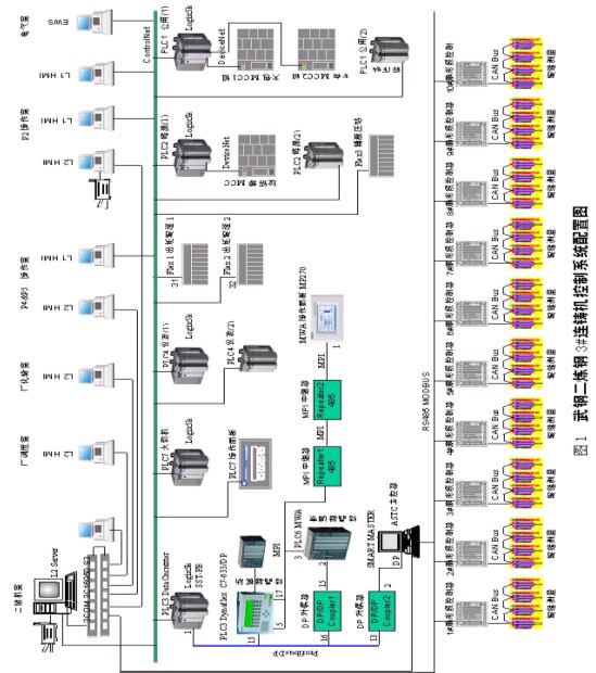 本項目的控制平臺為美國羅克韋爾自動化公司ALLEN-BRADLEY Logix5000,主體網(wǎng)絡(luò)CONTROLNET,設(shè)備網(wǎng)DEVICENET+Profibus+Modbus,分布式I/O FLEX 1794+Canbus。運行RSView32系統(tǒng)畫面的PC機通過1784-PCIC(S)專用網(wǎng)卡連入CONTRETNET,單機運行版。系統(tǒng)配置圖如圖1所示。其中三臺L1 HMI和一臺EWS為運行RSView32系統(tǒng)的PC機。