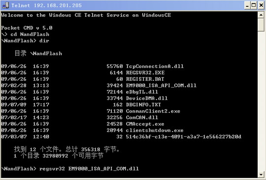 ISA COM組件的核心文件就是英創提供的EM9000_ISA_API_COM.dll動態鏈接庫文件,首先需要將它在目標嵌入式工控主板上注冊。用戶可以使用Visual Studio Remote Tools提供的“遠程文件查看器”連接目標嵌入式工控主板,并將英創提供的EM9000_ISA_API_COM.dll和REGSVR32.exe這兩個文件下載到目標主板的Flash存儲器上去(這里假設下載到EM9000的NandFlash)。然后在開發主機PC上使用Telnet連接目標工控主板(如圖),進入放置剛才下載這兩個文件的Flash存儲器目錄,運行: