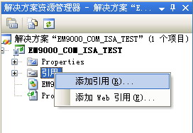 接下來可以進入C# COM組件開發。首先將EM9000_ISA_API_COM.dll文件復制到用戶的C#工程目錄下,然后在Visual Studio 2005.NET集成開發環境中打開用戶工程。為了使用ISA總線COM組件,必須為該工程添加外部引用;用戶可在集成開發環境的右側的“解決方案資源管理器”中找到“引用”,對其單擊鼠標右鍵,然后單擊“添加引用”(如圖)。