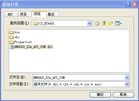 在彈出的“添加引用”對話框中,選擇“瀏覽”選項卡,并在你的工程目錄下找到你剛才復制過來的EM9000_ISA_API_COM.dll文件,選擇它,并單擊“確定”。