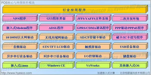 在嵌入式操作系統(tǒng)如WinCE和Linux等之上,各種底層驅(qū)動(dòng)程序、應(yīng)用程序與通訊程序、圖形環(huán)境程序協(xié)同工作,可以實(shí)現(xiàn)桌面式POS、輕便型POS、無線移動(dòng)型POS,實(shí)現(xiàn)新型、專門用途、特別定制的POS終端。 |