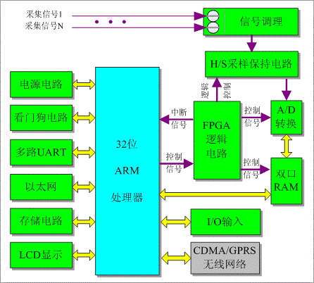 恒頤高速同步數(shù)據(jù)采集系統(tǒng)主要包括以下幾個(gè)部分:ARM控制器、存儲(chǔ)電路、FPGA邏輯控制電路、A/D轉(zhuǎn)換電路、FIFO緩存、電源電路、接口電路等。 系統(tǒng)具備多通道數(shù)據(jù)采集接口,F(xiàn)PGA邏輯電路控制A/D采集和FIFO緩存模塊,實(shí)現(xiàn)長(zhǎng)時(shí)間不間斷的數(shù)據(jù)采集與數(shù)據(jù)轉(zhuǎn)換;同時(shí)系統(tǒng)具有豐富的外圍控制接口和通信接口,可以實(shí)現(xiàn)數(shù)據(jù)的存儲(chǔ)、顯示,完成RS485/RS232或高速以太網(wǎng)絡(luò)的數(shù)據(jù)傳輸。 系統(tǒng)硬件結(jié)構(gòu)如圖所示: |
