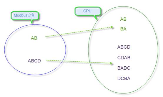 16位以上的數據是由多個字節組成的,獲取的設備響應的數據是包含了這些字節,如果不能明確地知道數據的組成字節順序,那么就不能正確的解析數據。非標準的Moubus設備內存中所存儲的數據字節順序會有變化,不一定符合一般從高到低排列的習慣。紫金橋的Modbus-RTU擴展驅動,可以很容易解決這個問題。它支持16位和32位數據的字節順序轉換解析。