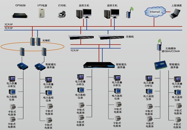圖3 ACR120EL、ACR230ELH多功能電表外形及其在配電抽屜柜中的應用 3、系統組網 電力儀表可作為內部管理電表單獨使用,取代大量傳統的模擬儀表,亦可作為電力監控系統的前端設備,實現遠程數據采集與控制。符合工業標準的RS485通訊接口,使得組網輕松便捷,是SCADA系統集成的理想選擇。大型公共建筑電能管理系統可以根據現場情況,采用現場總線以光纖環網、以太網或無線等組網方式實現電能集抄與電能分項計量功能。系統以計算機、通訊設備、現場電力儀表計量裝置為基本工具,為實時數據采集、遠程管理與控制提供了基礎平臺,它可以和檢測、控制設備構成復雜的電力監控與電能管理系統。該系統主要采用分層分布式計算機網絡結構,分站控管理層、網絡通訊層和現場設備層[3](如圖4)。