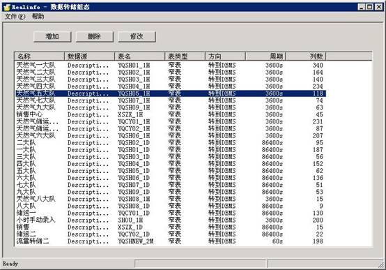 在這個界面中,用戶可以完成增加、刪除和修改數(shù)據(jù)表等操作。數(shù)據(jù)轉(zhuǎn)儲組件將轉(zhuǎn)儲的單位定義為數(shù)據(jù)表,用戶可以定義數(shù)據(jù)表中轉(zhuǎn)儲的數(shù)據(jù)、轉(zhuǎn)儲的時間和時間間隔等相關(guān)信息。