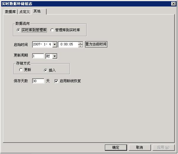 在“其他”標(biāo)簽頁中,用戶可以配置數(shù)據(jù)流向、啟始時間、更新周期、存儲方式等信息。在這里說明一下“啟用斷線恢復(fù)”功能。