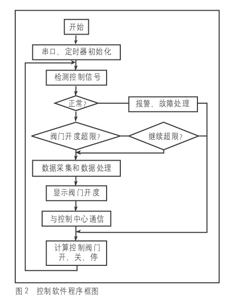控制軟件采用C語言,為提高程序的可靠性和可理解性,將程序設(shè)計(jì)成相對(duì)獨(dú)立的子程序,有利于程序的移植和修改。控制軟件主要功能是接收來自控制中心的指令或控制器上開、關(guān)鍵指令;接受閥門開度反饋信號(hào),計(jì)算后輸出控制信號(hào);向控制中心反饋信息;實(shí)時(shí)顯示閥門開度;故障報(bào)警、故障處理,其程序主框圖如圖2。