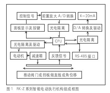 針對(duì)上述問題,上海銳凱儀表有限公司花大力氣開發(fā)了新一代RK-Z系列智能電動(dòng)執(zhí)行機(jī)構(gòu),較好解決了這些缺陷和不足。RK-Z系列智能電動(dòng)執(zhí)行機(jī)構(gòu)系統(tǒng)構(gòu)成見圖1所示。它采用全封閉、一體化結(jié)構(gòu),配以單相永磁式交流同步電動(dòng)機(jī),體積小、重量輕、結(jié)構(gòu)簡(jiǎn)單、傳動(dòng)慣量小、轉(zhuǎn)矩大等特點(diǎn)。限位和剎車采用逐步逼近電子技術(shù),實(shí)現(xiàn)了閥門“柔性全開”和“柔性全關(guān)”,取消了限位開關(guān)和剎車片,解決了長期以來困擾的限位開關(guān)易失靈、剎車片易“抱死”以及剎車時(shí)易產(chǎn)生大沖擊電流燒壞電動(dòng)機(jī)等老大難問題。為提高整機(jī)可靠性,采用了可靠性設(shè)計(jì)、可靠性試驗(yàn)、失效分析和嚴(yán)格的篩選、老化等工藝措施,并最大限度地減少了可動(dòng)部件,使整機(jī)MTBF值達(dá)到40000萬小時(shí)以上。