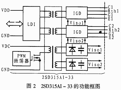 圖2為2SD315AI-33的功能框圖。它主要由DC/DC轉(zhuǎn)換電路、輸入處理電路、驅(qū)動(dòng)輸出及邏輯保護(hù)電路組成。