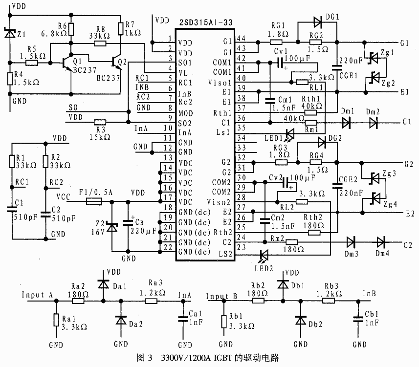 筆者所在實(shí)驗(yàn)室中正在設(shè)計(jì)的“雙逆變器-電機(jī)”能量互饋式交流傳動(dòng)試驗(yàn)系統(tǒng)由于采用專為電力機(jī)車所設(shè)計(jì)的300kW異步電機(jī),故逆變器和變流器的主開關(guān)器件選用的是EUPEC公司的高壓IGBT 模塊FZ1200R33KF1。該器件的電壓等級(jí)為3300V,電流等級(jí)為1200A。根據(jù)FZ1200R33KF1對(duì)驅(qū)動(dòng)保護(hù)電路的要求以及2SD315AI-33驅(qū)動(dòng)模塊的性能特點(diǎn),筆者設(shè)計(jì)了IGBT的驅(qū)動(dòng)保護(hù)電路,具體如圖3所示。