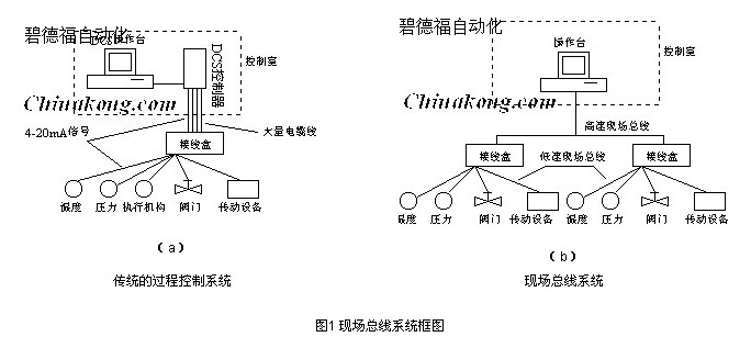 通過使用現場總線,用戶可以大量減少現場接線,用單個現場儀表可以實現多變量通信,不同制造廠生產的裝置間可以完全互操作,增加現場一級的控制功能,系統集成大大簡化,并且維護十分簡便。典型的現場總線系統框圖如圖1.從圖1(a)中可以看出,傳統的過程控制系統中,每個現場裝置到控制室都需使用一對專用的雙絞線,以傳送4-20mA信號,圖(b)所示現場總線系統中,每個現場裝置到接線盒雙絞線仍然可以使用,但是從現場接線盒到中央控制室僅用一根雙絞線完成數字通信。
