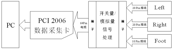 左、右手操作手柄和腳踏板的操作產生模擬量和數字量的控制信號,這些信號被PCI2006數據采集卡采集后輸入到計算機,由計算機及時反映出模擬器的動作。