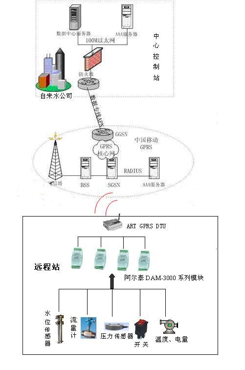各個遠程站采用阿爾泰RTU-6100多功能采集系統對現場設備進行采集和通訊處理。利用各種傳感器來測得 水位、壓力、流量 、工作機組的溫度,還可以利用開關量來控制水 泵 的啟停 等 。各種數據從RTU-6100傳送到GPRS模塊, ,由GPRS模塊把數據打成TCP/IP 包,發送到中心監控站 。