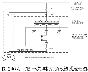5 項目實施 5.1 基礎施工 2臺干式整流變安裝在原四期增壓泵房中,變頻器柜及旁路柜安裝在380V7A、7B段母線室內。2004年4月22日,開始拆除增壓泵房中的軟化水裝置,開挖電纜溝,至5月15日完成澆筑變壓器基礎及變頻器柜、旁路柜基礎槽鋼埋設等。 5.2 設備安裝 本項目設備安裝就位及電纜敷設由浙江華業公司承包,動力電纜由檢修分場接線,控制電纜由自動化分場接線。5月17日,旁路柜、干式整流變運抵我廠,5月27日,2臺干式變安裝就位。5月28日即開始干式變側動力電纜頭制作。6月5日,變頻器柜運抵我廠。6月7日變頻器柜、旁路柜均安裝就位。6月8日至10日,完成變頻器柜、旁路柜側動力電纜頭制作,電纜預試等。6月11日至16日,完成控制電纜接線,#7A、7B一次風機6KV開關柜控制回路改造以及風道制作安裝等。 5.3 裝置的連鎖保護 系統保留原有對電機的保護及其整定,以確保電機工頻旁路時的啟動和正常運行,同時實現工頻旁路時對電機的保護和變頻運行時對變頻器的保護。 為了防止產生操作和事故情況下產生過電壓等影響變頻器的壽命的因素,變頻器在控制系統受電自檢正常后才能允許合6kV開關,具體實現在6kV開關的合閘回路中,6kV開關合上變頻器充電后,自檢正常發出準備好信號,才能啟動變頻器運行。此邏輯由熱控實現,同樣在正常或緊急停運時均先停變頻器,然后斷開高壓開關,為此在綜合保護出口和風機緊急跳閘出口控制回路中串有中間繼電器,直接去關變頻器,短延時去斷開高壓開關。 5.4 設備調試 6月15日,控制電源上電開始設備調試。主要進行了以下檢查、測試項目: a. 裝置外觀檢查。 b. 硬件及跳線設置檢查。 c. 檢查一次接線和控制回路接線正確。 d. 絕緣檢查,用2500V搖表測一次回路對地絕緣電阻歷時一分鐘其值為120MΩ。 e. 檢查冷卻風扇工作正常,風壓值為3.1V,報警值2.7V,跳閘值2.1V。 f. 核對變壓器和變頻器相位,發現#7A一次風機變頻隔離變壓器高壓側電纜接反,在旁路柜改接后正確。 g. 電阻檢查,驗證SCR、SGCT功率器件和所有相關緩沖電路正常。 h. 控制電源測試。因380V7A段電源低電壓切換時會造成變頻器停運,控制電源改接至#7機UPS。 i. 門極測試、系統測試、18脈沖相序測試。 j. 直流電源測試。 k. 變頻器參數整定。 l. 變頻器加中壓,做運行前檢查。 m. 變頻器帶電機空載調試,轉速從180~1500rpm時電流保持在20A,電壓從520V升至5800V。 n. 變頻器帶風機負載調試。