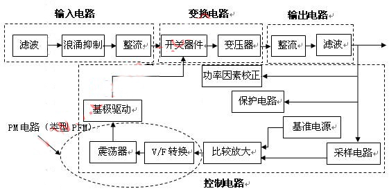 如果細(xì)致劃分,它包括:輸入濾波、輸入整流、開(kāi)關(guān)電路、采樣、基準(zhǔn)電源、比較放大、震蕩器、V/F轉(zhuǎn)換、基極驅(qū)動(dòng)、輸出整流、輸出濾波電路等。