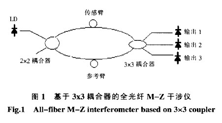 地震加速度計由傳感探頭、光電轉換及信號處理系統構成.傳感探頭由采用基于3x3耦合的光纖M—z干涉儀和相關機械部分組成.如圖1所示,干涉儀的輸入端是一只2x2耦合器,輸出端是一只3x3耦合器,被測信號加在干涉儀的傳感臂上.