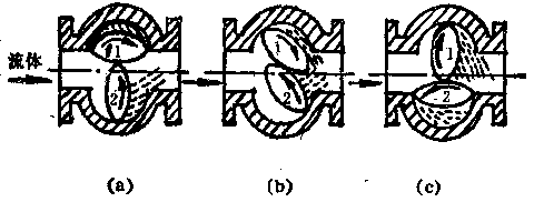 橢圓齒輪在被測介質(zhì)的壓差△p=pl-p2的作用下,產(chǎn)生作用力矩使其轉(zhuǎn)動。在(a)所示位置時,由于P1>P2,在P1和P2的作用下所產(chǎn)生的合力矩使輪1產(chǎn)生順時針方向轉(zhuǎn)動,把輪1和殼體間的半月形容積內(nèi)的介質(zhì)排至出口,并帶動輪2作逆時針方向轉(zhuǎn)動,這時1為主動輪,2為從動輪,在 (b)上所示為中間位置,1和2均為主動輪;而在(c)上所示位置,P1和P2作用在1輪上的合力矩為零,作用在2輪上的合力矩使2輪作逆時針方向轉(zhuǎn)動,并把已吸入半月形容積內(nèi)的介質(zhì)排至出口,這時2為主動輪,1為從動輪,與 (a)上所示情況剛好相反.如此往復(fù)循環(huán),輪1和輪2互相交替地由一個帶動另一個轉(zhuǎn)動,將被測介質(zhì)以半月形容積為單位一次一次地由進(jìn)口排至出口.顯然,圖上(a)、(b)、(c)所示,僅僅表示橢圓齒輪轉(zhuǎn)動了1/4周的情況,而其所排出的被測介質(zhì)為一個半月形容積.所以,橢圓齒輪每轉(zhuǎn)一周所排比的被測介質(zhì)量為半月形容積的4倍,則通過橢圓齒輪流星計的體積流量Q為: