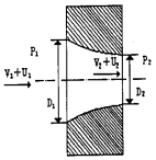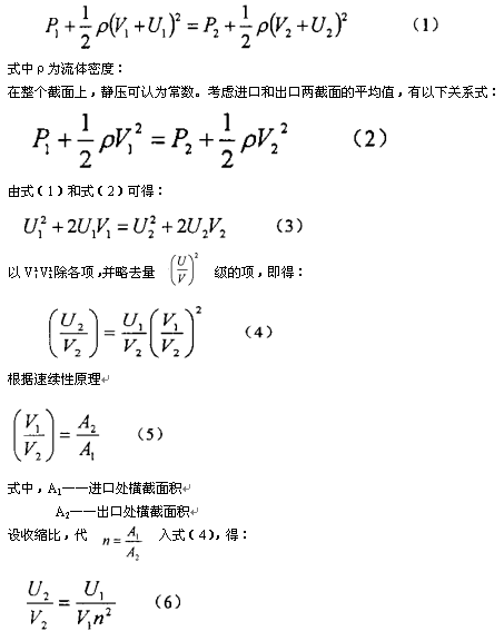 采用了變徑整流器后(見圖2),由于縮經(jīng)斷面的流速在逐漸增大,在斷面上各點(diǎn)流速的增加是不一樣的,靠近中心流速增加小,而靠近喉徑邊沿處流速增加大。 設(shè)整流器進(jìn)口處壓力為P1,平均流速為V1,某點(diǎn)上的速度不均勻度為U1,出口處壓力為P2,平均流速為V2,通過進(jìn)口處某點(diǎn)同一流線,在出口處的速度不均勻度為U2,沿該流線,由伯努利方程得: |