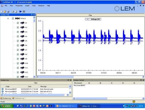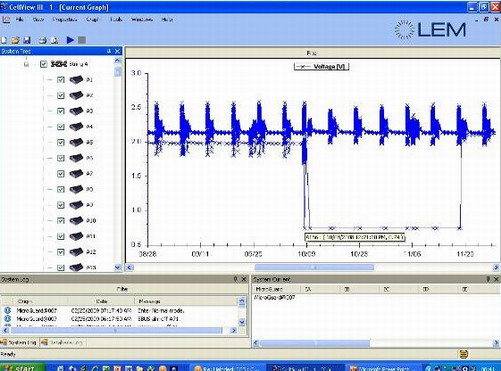 圖中明確地指出,一個電池單元提供的電壓為2V,而不是標稱的2.2V。雖然電池提供的電壓比預期的低,不過這種差別相對較小(在正常接受范圍內),而且是穩定的。這種特性很典型,采用輸出電壓作為電池即將失效的指標不再可靠,因為電壓值可以保持在閥值范圍內,因此不會觸發報警。這就是發生在這個例子中的;在收集這些數據時,監測系統用于評估定期維護方案的有效性,而不是用于警告潛在的問題。由于沒有采取任何措施,該電池單元后來在圖2所覆蓋的時期內嚴重失效;水平軸表示測試進行的日期。不過,在失效點(電池單元電壓下降至0.7V)以前,故障電池組的電壓從本質上保持恒定,沒有任何即將失效的跡象。最后,維護人員在11月更換了該單體電池,隨后電壓恢復到整個電池陣列的平均值水平。