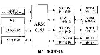 基于ARM的PC/104系統主要由處理器 、總線接口 、 Flash、實時時鐘 、復位電路 、通訊接口、調試接口、電源幾個部分組成 ,如圖 1所示。