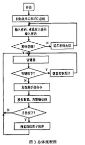 根據指紋識別模塊的協議 。編寫系統的程序 。主要分為通訊和管理兩個部分 ,一方面是發送指令幀 、接收數據及其校驗 ,另一方面。朋戶信息添加到數據庫和門禁開啟的用戶記錄(如號 、姓名、用戶信息和開啟時間)存人數據庫。通過鍵盤和 LCD液晶顯示 。進行現場顯示和控制操作 ,同時在液晶屏菜單上進行選擇,實現增加或刪除指紋庫 ,及修改個人信息,并在LPC210單片機的命令下 .能夠完成指紋錄人 、圖像處理 、特征提取 、模板生成、模板存儲、指紋比對(1:1)或指紋搜索(1:N)等功能。其總體流程圖如圖3所示。當有手指或鍵盤按下時,則執行相應的程序。