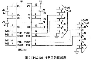 系統中采用 RS232的電平轉換芯片 MAX3232。具有兩路RS232電平轉換 .可實現與兩個 串口進行通訊 。MAX3232芯片的TTL/CMOS輸人輸 出信號與 LPC2104的 UART輸人輸出連 接 .MAX3232輸人輸出 IZl與串日 9針連接 器相 連。接線 圖如圖2所示。在使用 UART0時,先要設置TXD0、RXD0管腳連接。然后設置串El的波特率及工作模式。即可進行數據發送及接收。
