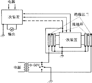 電磁流量計內流體中的雜散電流可能對流量計的輸出有影響。利用圖17所示的系統可以在液體內感應出電流。試驗應做兩個系列,即干擾電壓分別與主電源電壓同相及正交。誤差用量程百分數每安培表示。