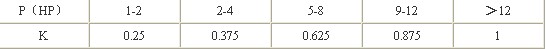 其中K = 水泵的工作系數,隨水泵功率不同而變化,具體見下表: