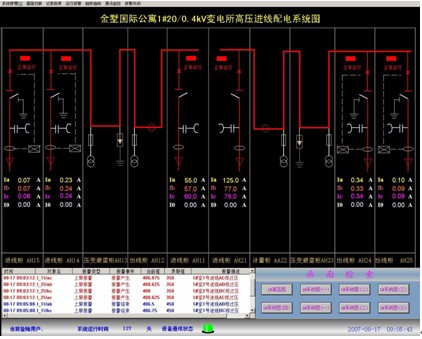 標準的變配電系統具有CAD一次單線圖顯示中、低壓配電網絡的接線情況;龐大的系統具有多畫面切換及畫面導航的功能;分散的配電系統具有空間地理平面的系統主畫面。主畫面可直觀顯示各回路的運行狀態,并具有回路帶電、非帶電及故障著色的功能。主要電參量直接顯示于人機交互界面并實時刷新。