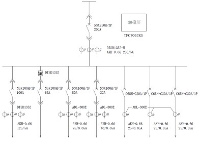 典型一次圖見圖1,由DTSD1352-H、DTSD1352、ADL-300E監控儀表及TPC7062KS觸摸屏組成電力監控系統。