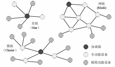 (4)近距離,高容量。傳輸范圍一般介于10~100 m,在增加RF發射功率后,亦可增加到1~3 km。這指的是相鄰節點間的距離,若通過路由和節點間通信的接力,擴展后達到幾百米甚至幾公里。ZigBee可采用星狀、片狀和網狀網絡結構。由一個主節點管理若干子節點,最多一個主節點可管理254個子節點。