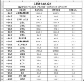 圖5.5為一段時間內的進線回路各項參數的具體數值,它詳細地記錄了進線回路三相電壓、電流、有功電能、無功能電能、功率因素、頻率參數。整個廠區各回路電能匯總如圖5.6所示,它記錄了一段時間內各個回路的耗電情況,包括各回路進行柜的總電能及分支電能。