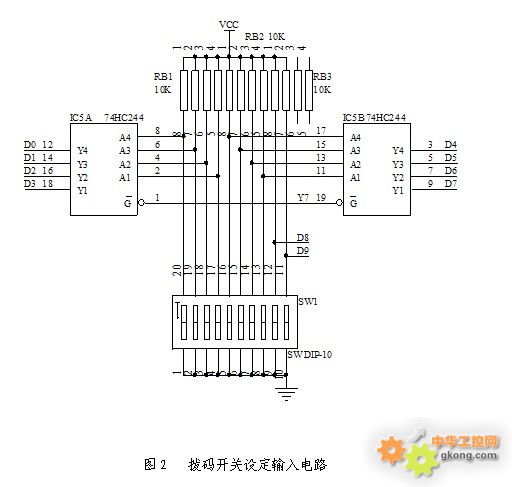 撥碼開關提供用戶一個簡化的人機接口,用于設定RS485通訊中的地址、波特率、數據格式等設定功能,撥碼開關(SW1)的10位數據口都接10k電阻上拉到Vcc,電路使用一個74HC244(IC5)數據緩沖器,把撥碼開關的狀態傳送到8位數據總線,剩余兩根數據線則直接接到CPU的I/O端口(見圖2)。
