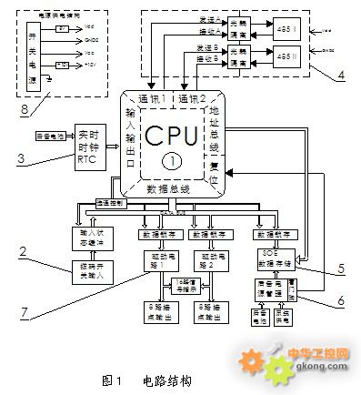 ARTU-J16遙控單元硬件主要包括主CPU芯片、撥碼開關設定輸入、實時時鐘、雙路RS485通訊、SOE事件記錄存儲、看門狗控制、繼電器控制及輸出、供電電源模塊等8部分組成(見圖1)。