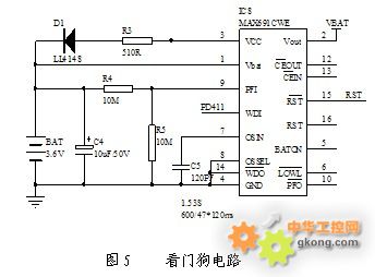 掉電自動保存部分使用MAX691CWE(IC8)作為電源管理,在系統有輔助供電的情況下保證IC3由主電源Vcc供電,當主電源掉電時則自動切換到后備電池供電方式。同時此芯片還兼有看門狗功能,在系統死機的極端情況下及時復位CPU使系統快速恢復至受控狀態(見圖5)。