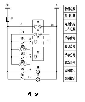 以某配電系統為例,1臺ARTU-J16控制8路低壓饋線,CM1斷路器配電動機操作機構,一次方案見圖8(a),控制方式見圖8(b)。啟停按鈕現場手動控制各回路斷路器的合、分閘,遙控單元通過通訊接口集中控制8路斷路器的工作狀態,實現斷路器就地與遠程兩地控制的工作模式。