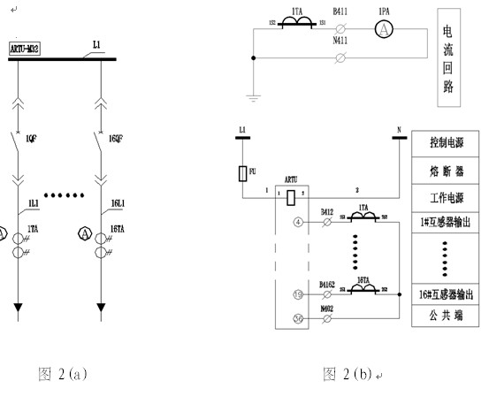 以檢測(cè)16路饋線的工作電流為例,一次方案見圖2(a),電流互感器采用AKH-0.66S低壓雙繞組互感器,用于電流采集,一次側(cè)額定電流5A-6300A,二次輸出有2個(gè)繞組,一組輸出0-5A(或1A),給99T1、6L等指針表作當(dāng)?shù)仫@示電流值,另一組輸出交流0-20mA,給ARTU-M32單元遠(yuǎn)傳遙測(cè),見圖2(b),電流測(cè)量回路通過指針表顯示各饋線回路相應(yīng)的電流值,遙測(cè)回路利用通訊端口遠(yuǎn)程集中顯示各回路電流值。