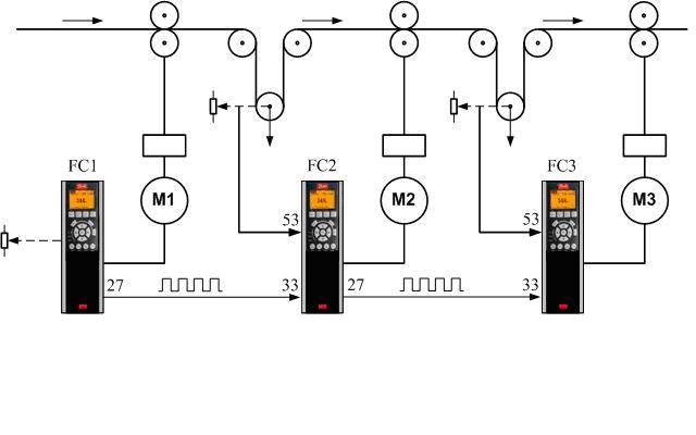 FC1工作在開環狀態。其速度輸出送往后段作為擴展PID控制的前饋輸入,可采用脈沖方式或模擬量方式。后段變頻器同時要引入此驅動器前側的跳舞輪處電位器反饋信號。理想狀態是在跳舞輪處于最佳位置時,電位器位于5V位置。