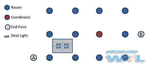圖5顯示星型網絡與傳統網狀網絡均不適用的照明系統。其中信號需要長距離傳輸至能夠回報電力中斷的節點。不同于ZigBee在大范圍的區域內傳播信息,這里的信息須要朝適當的方向線性傳輸。