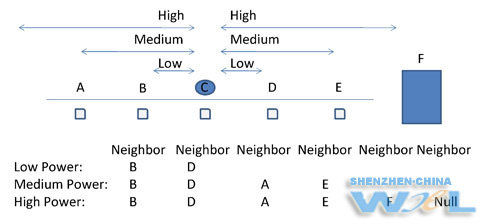 在正常的運作中,節點會以-10dBm向最鄰近的節點進行通訊,節省節點的電力,并且維持網絡的正常狀態。如果系統節點C停止運作,節點B及D會增強功率,以略過該節點進行通訊。當然,節點D應該向集中裝置回報節點C已停止運作。網絡范圍主要受限于節點距離、起始節點與最終目的地節點之間的中繼次數,以及其所定義的系統所需延遲。