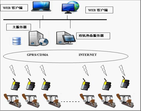 監(jiān)控中心服務(wù)器安裝紫金橋實(shí)時(shí)數(shù)據(jù)庫(kù),采用雙機(jī)熱備,充分保證系統(tǒng)的穩(wěn)定性和安全性,中心數(shù)據(jù)庫(kù)完成井下數(shù)據(jù)的存儲(chǔ),處理和分析等;液面、流壓、溫度這些終端節(jié)點(diǎn)數(shù)據(jù)通過(guò)GPRS無(wú)線網(wǎng)絡(luò)傳輸至中心數(shù)據(jù)庫(kù),在中心可通過(guò)監(jiān)控畫(huà)面上的電子地圖點(diǎn)擊進(jìn)入?yún)^(qū)塊分布圖界面,查看每口井的實(shí)時(shí)數(shù)據(jù),數(shù)據(jù)的報(bào)警信息,設(shè)置各參數(shù)的報(bào)警上下限趨勢(shì)分析,實(shí)時(shí)歷史日?qǐng)?bào)表和月報(bào)表等信息。