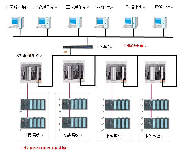二、系統(tǒng)配置 本系統(tǒng)完全為高爐操作提供服務,使被控設備能在主控樓的計算機上方便的進行集中操作,并對這些設備的運行情況做如實的記錄 1、自動監(jiān)控系統(tǒng): 1.1 采用的網絡結構 上位機采用工業(yè)以太網,充分滿足上位機之間數據傳輸量大的要求;PLC與遠程站之間采用PROFIBUS-DP現場總線,以滿足現場數據傳輸的實時性和可靠性;網絡框圖如圖一所示: 圖一