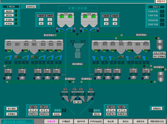 高爐爐頂儀表,對保證爐頂設備是否正常十分重要。  2、礦槽畫面 主要包括皮帶、料斗、振篩運行、停止、故障指示及操作。可以在此畫面提前設定各種料質重量,根據爐長下的各種料批要求通過調整周期表來完成自動上料。也可通過機旁轉換開關使個別控制轉到現場操作,畫面中有手動(綠色)、自動(紫色)指示。另外還有周期表子畫面。 圖三