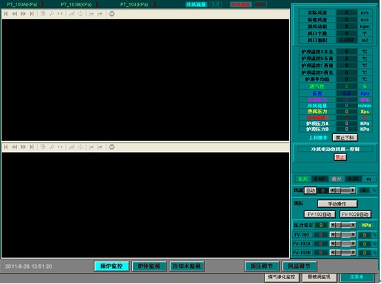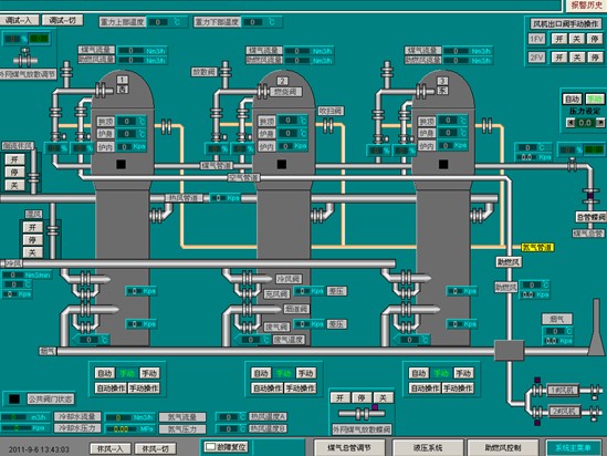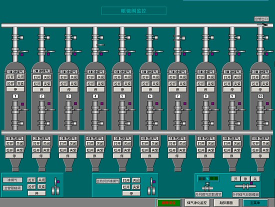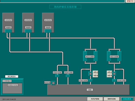 3、熱風爐畫面 此畫面中可實現助燃風機、調壓閥組、助燃調節(jié)閥、混風閥、冷風閥、熱風閥、放散閥、冷風均壓閥、煤氣調節(jié)閥、空氣調節(jié)閥、空氣切斷閥、煤氣切斷閥各種工藝閥門的操作并顯示儀表參數。能自動完成熱風爐的各階段轉換達到自動送風、燜爐 、燒爐。各種閥門在畫面中可實現點動操作,調節(jié)閥各通過輸入預定數值或點擊滾動條自動調節(jié)。 圖四